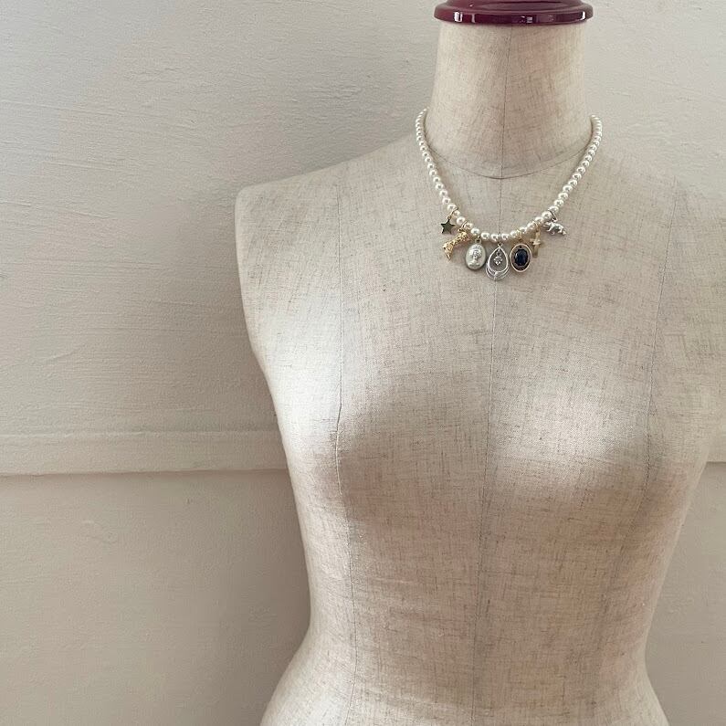 クラッシックなパールに個性豊かなデザインのUSEDチャーム達を組み合わせた、ModernLoopオリジナルのアップサイクルネックレスです。