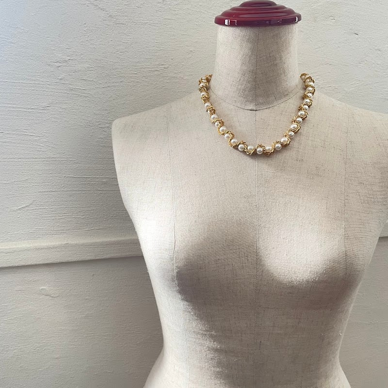 パールにチェーンを編み込んだ、ボリュームあるデザインが魅力のネックレスです。