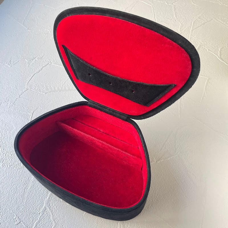 形や色がクラシックな雰囲気のあるボックスに、時代を感じるモチーフを装飾した1点もののジュエリーボックス。