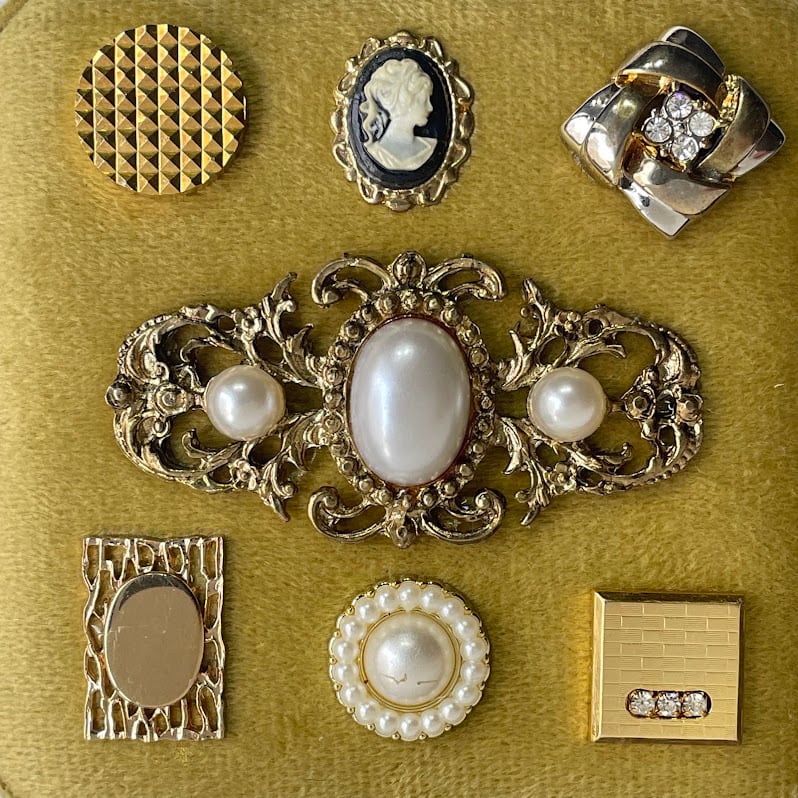 本製品はUSEDブローチのモチーフ部分を装飾として使用しています。装飾部分に強い力を加えたり、無理に押したりすると破損する恐れがありますので、取り扱いにはご注意ください。