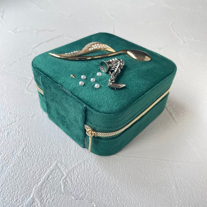 新品のジュエリーボックスに、ユーズドアクセサリーのモチーフ部分を装飾したアップサイクルアイテム。