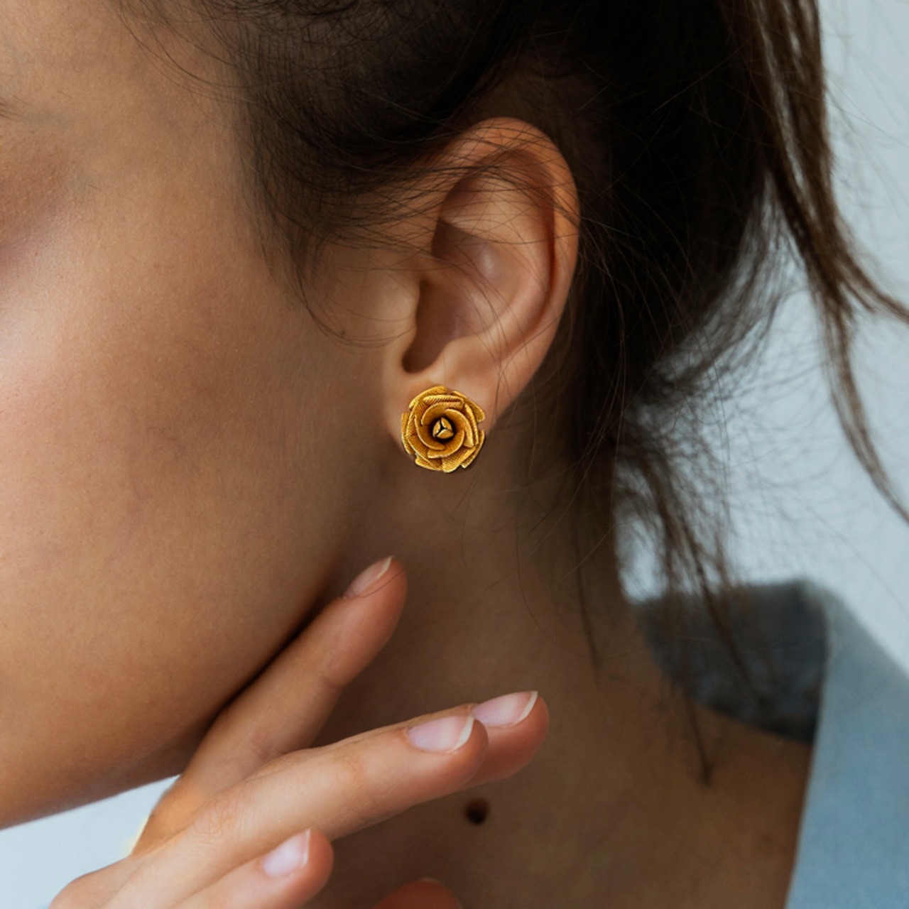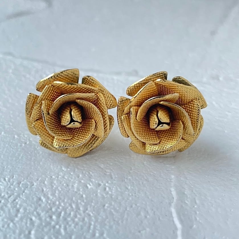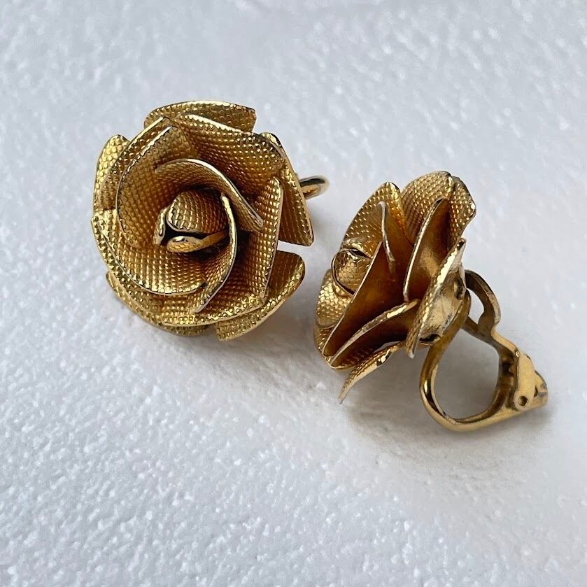 テクスチャーが入ったメタルが、立体的にデザインされたローズモチーフのイヤリングです。
