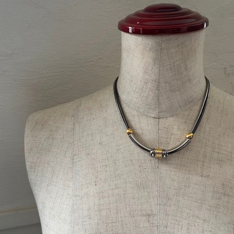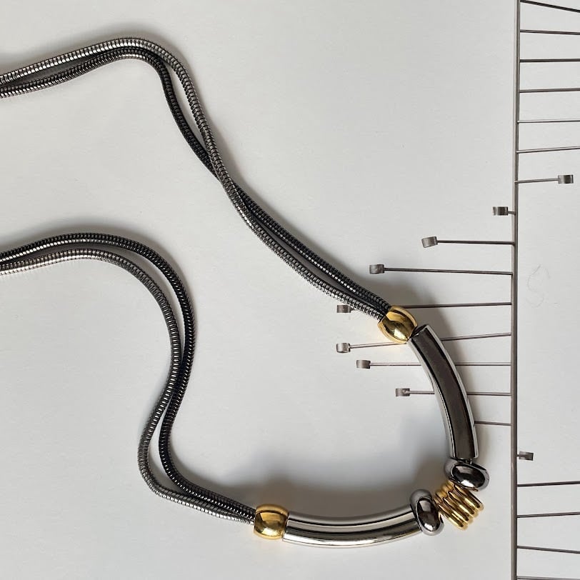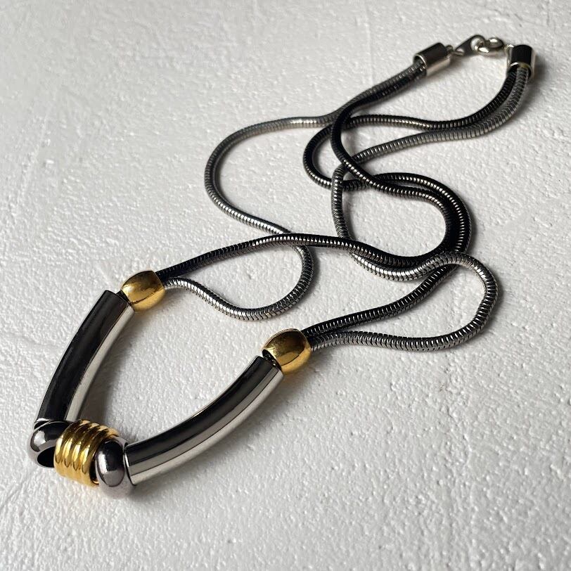 メタルパーツにロジウムとガンメタのコンビチェーンを通した雰囲気あるネックレスです。