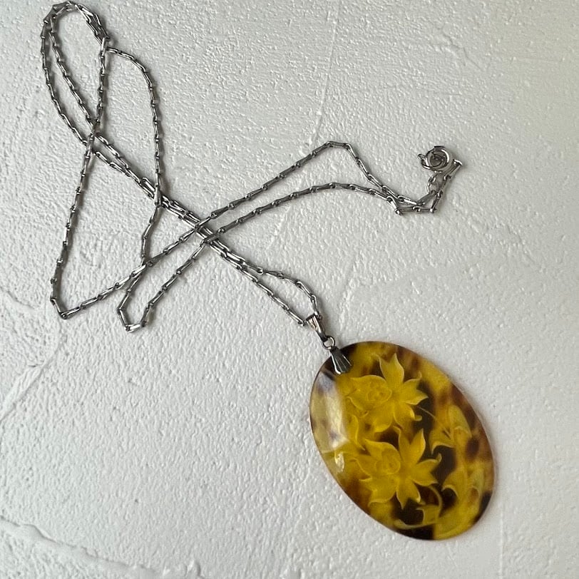 モチーフを裏側から彫刻し、表から見た時にバラが立体的に見えるよう、特殊な技術で作られたネックレスです。