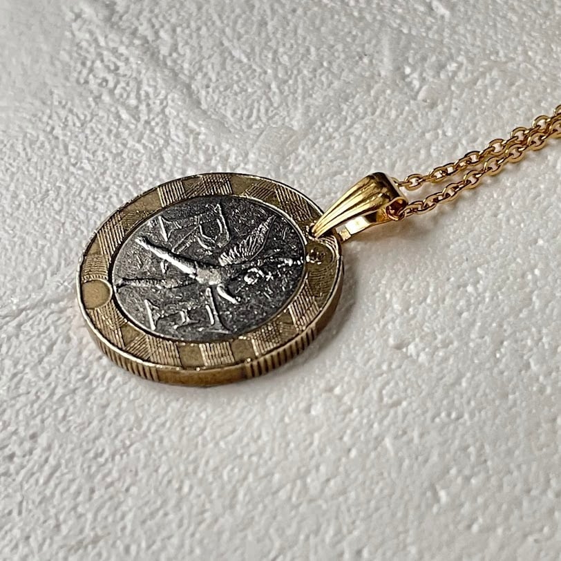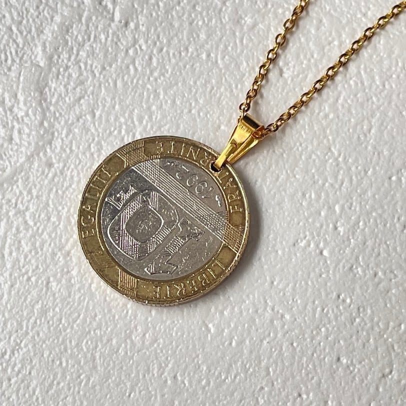 フランスで1992年に発行されたヴィンテージコインをリメイクして作られた、ハンドメイドのネックレスです。