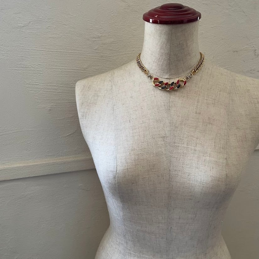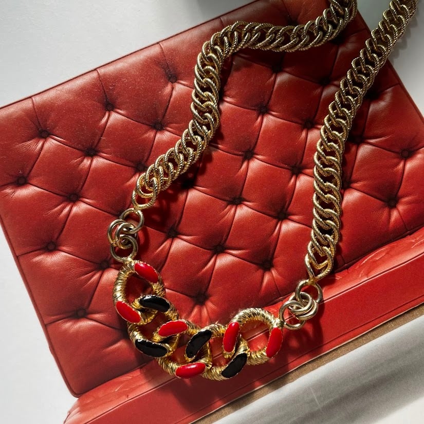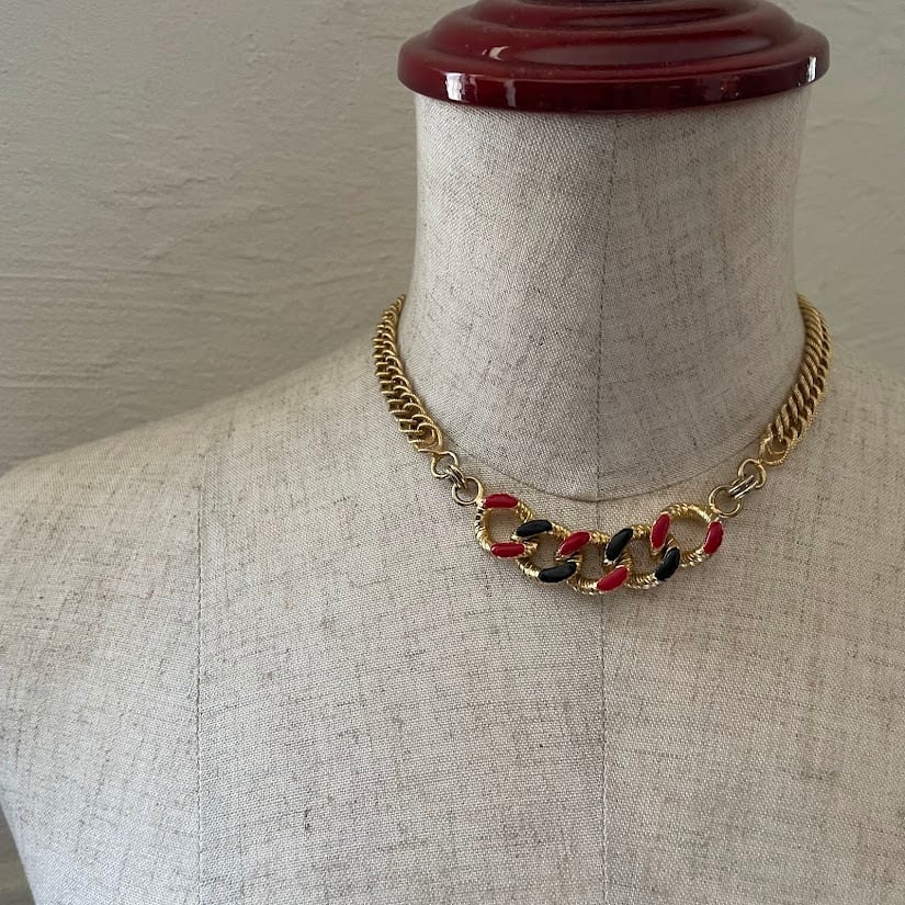 表情の違うチェーンの組み合わせと、赤と黒のコントラストが魅力のネックレスです。