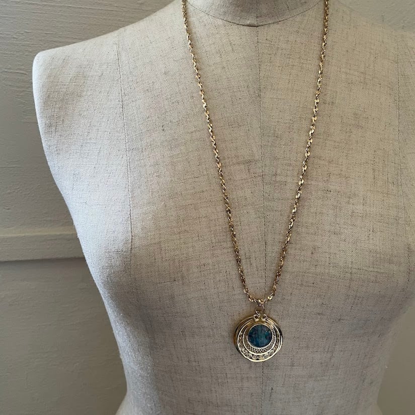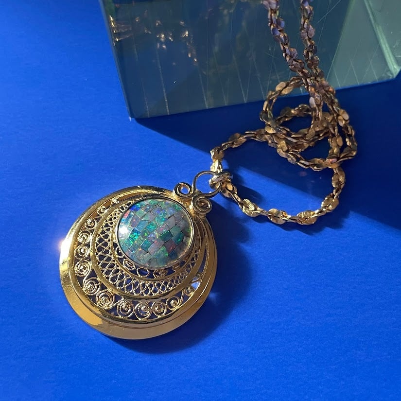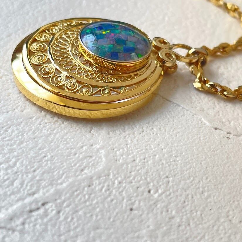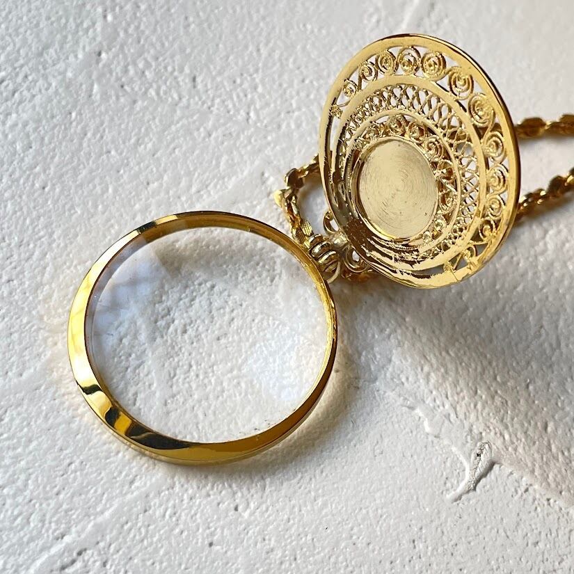 小さなオパールの薄片を集めて作っているレンズカバーが雰囲気ある、目から離して見るタイプのルーペのネックレスです。