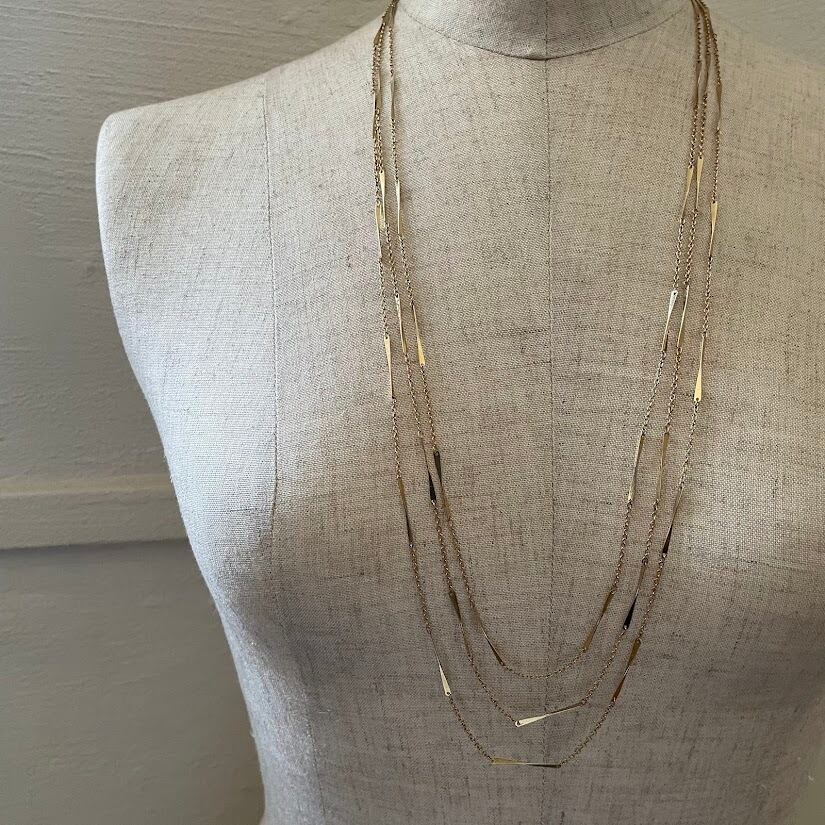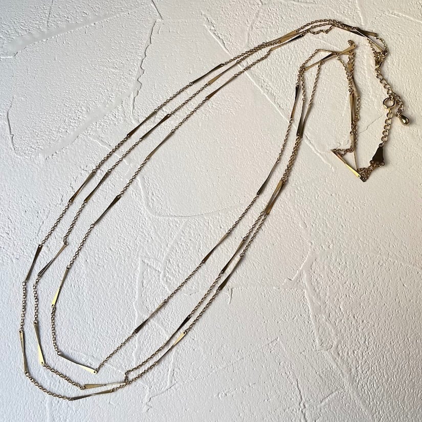 捻りのあるデザインパーツがポイントの、重ね付けしているように見える3連のネックレスです。