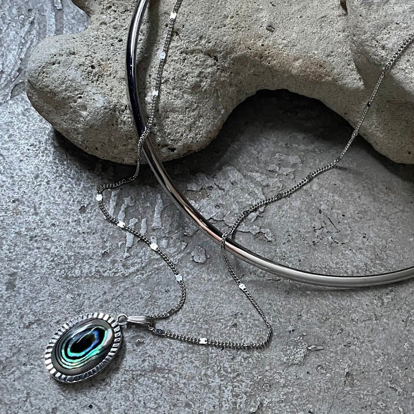 チェーンの長さや配置を調整し、着けるだけで首元がきれいに見えるバランスに仕上げています。