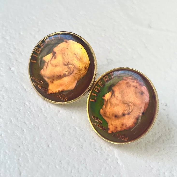 ヴィンテージのカフスをリメイクしたパーツに、シルバー925を組み合わせたアップサイクルアイテム。コインの部分が温度によって、色がグリーンやブラックに変わる仕様になっています。
