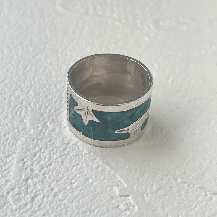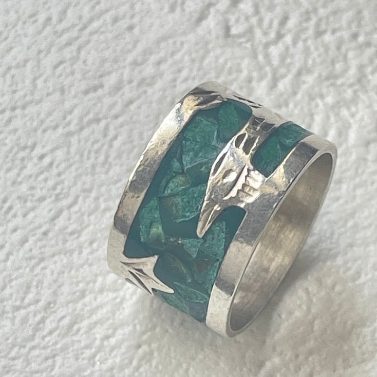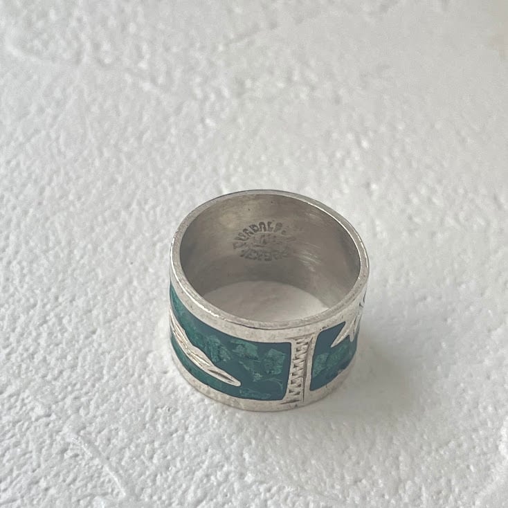 鳥が描かれた、ターコイズのチップを使ったシルバー925のリングです。