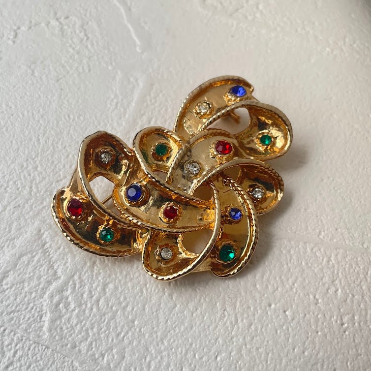 立体的なデザインに、たくさんのガラスストーンが輝く華やかなブローチです。