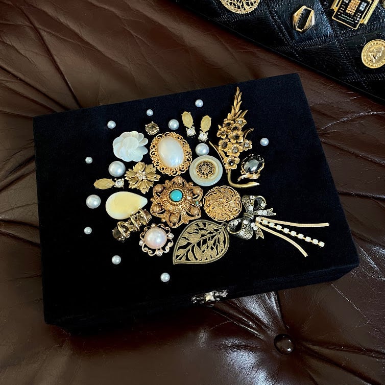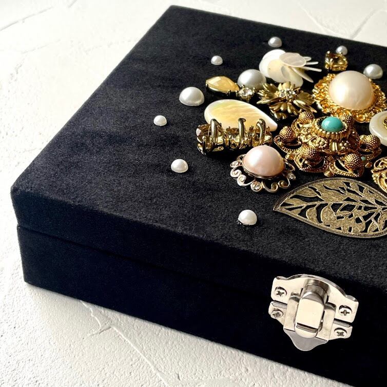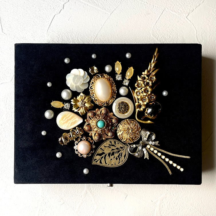 新品のジュエリーボックスに、時代を感じるモチーフ達を花束に見立てて装飾した、1点もののアップサイクルジュエリーボックスです。