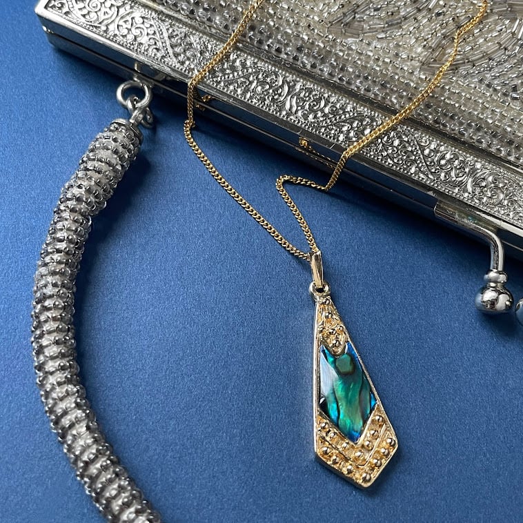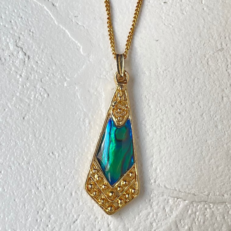 シェル部分が、反射の色合いで輝きが変わるネックレスです。