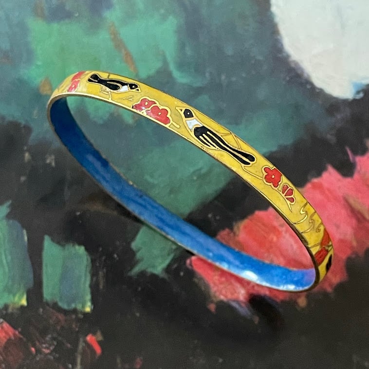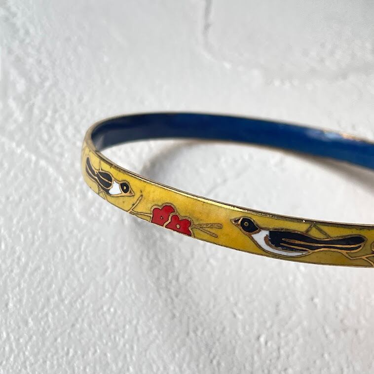 カラフルな色合いのトリと花のデザインが魅力のバングルブレスレットです。