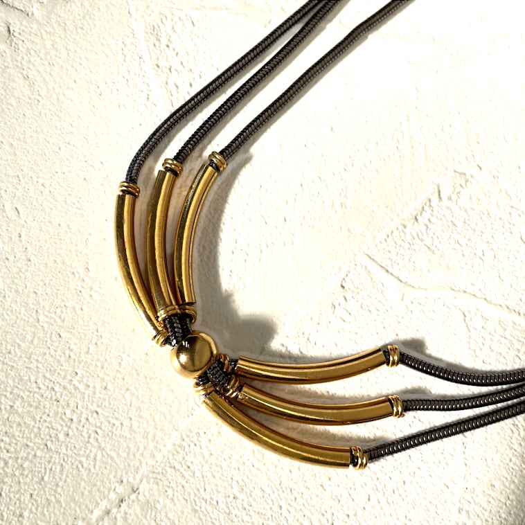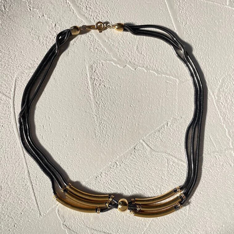 メタルパーツにガンメタのチェーンを通した雰囲気あるネックレスです。