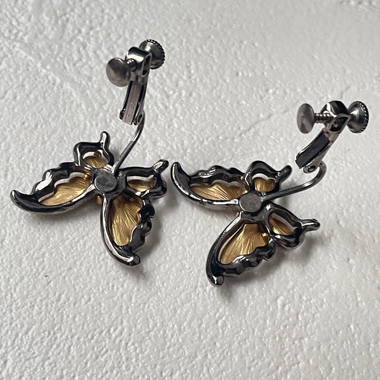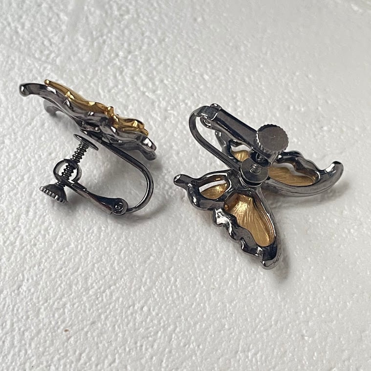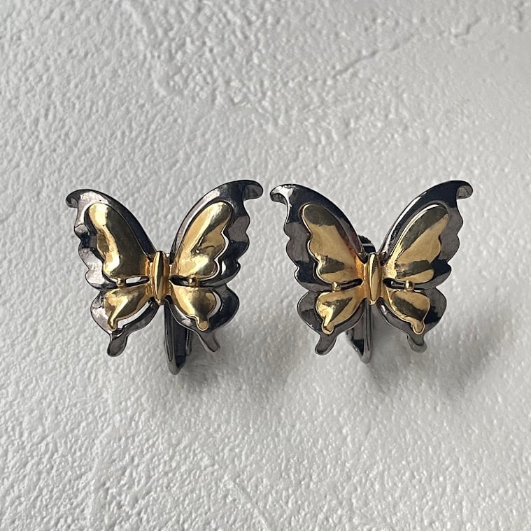 メタルを重ねた立体的な蝶のデザインが魅力の、コンビカラーのイヤリングです。