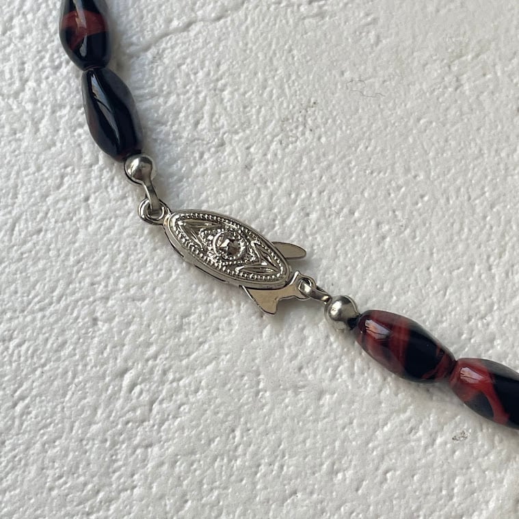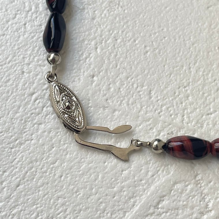 留め具はクラシックなデザインのバネ式クラスプです。着ける時はフックのような部分を本体の隙間に入れて、奥に押し込むと固定されます。