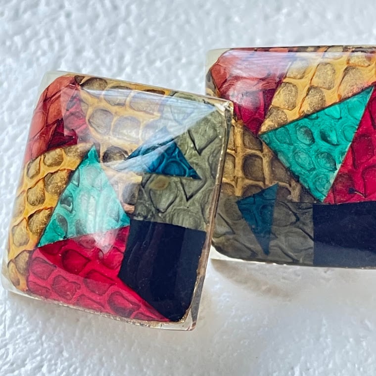 カラフルな色合いがコーディネートのポイントになる、蛇柄のイヤリングです。