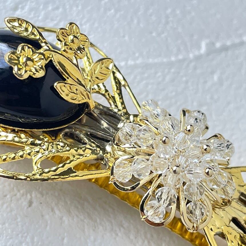 ガラスで作られたフラワーパーツが上品に輝く、ボタニカルデザインのバレッタです。