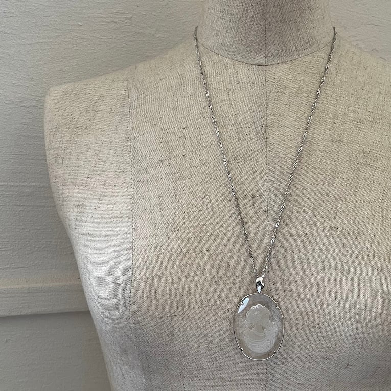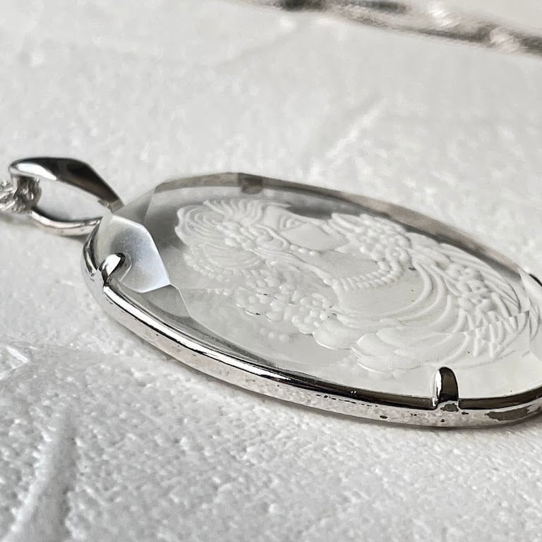 モチーフを裏側から彫刻し、表から見た時に立体的に見えるよう、特殊な技術で作られたネックレスです。