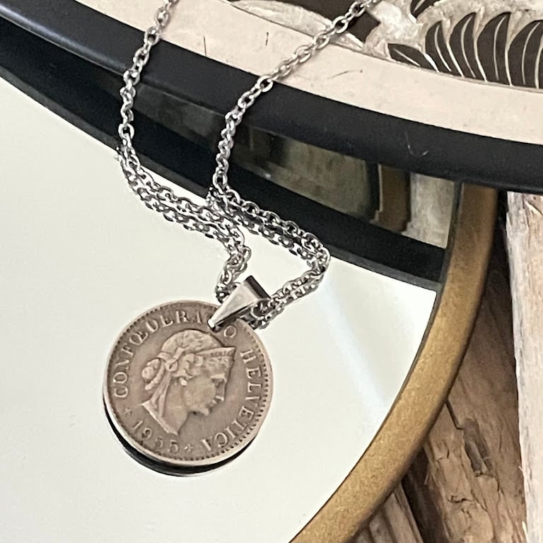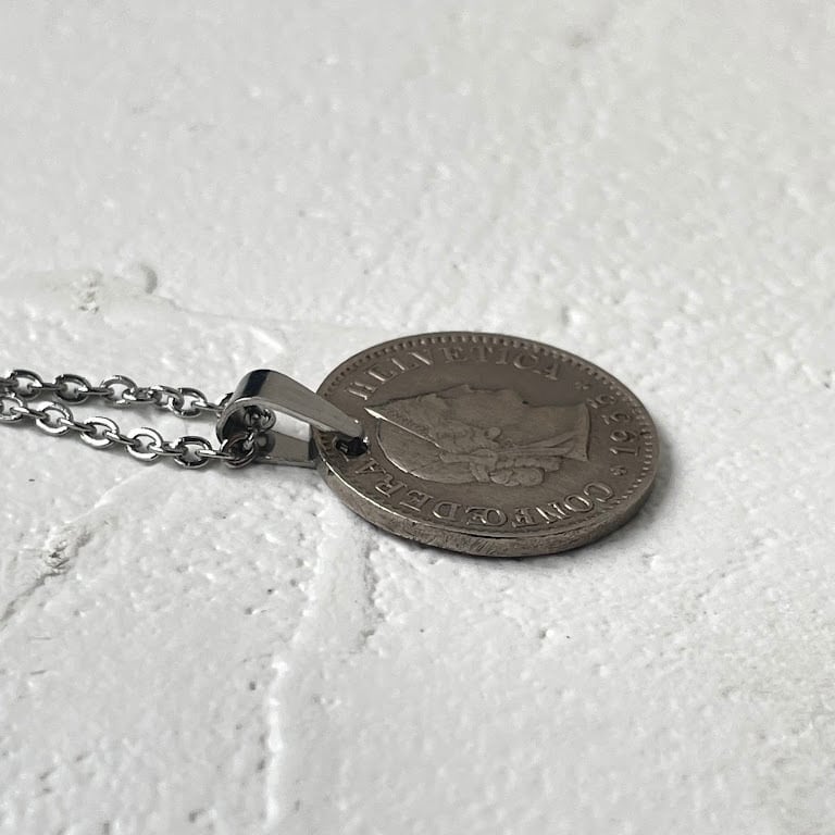 スイスで1955年に発行されたヴィンテージコインをリメイクして作られた、ハンドメイドのネックレスです。