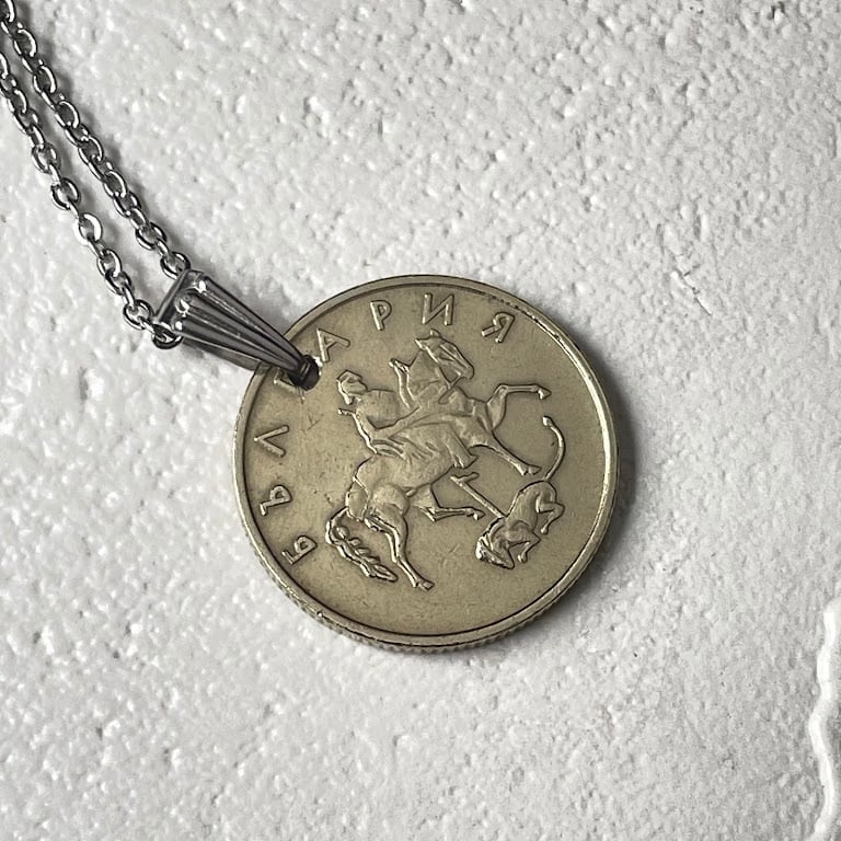 ブルガリアで1999年に発行されたヴィンテージコインをリメイクして作られた、ハンドメイドのネックレスです。
