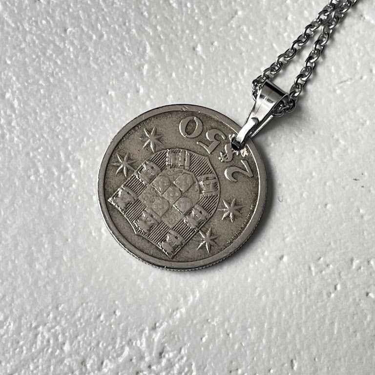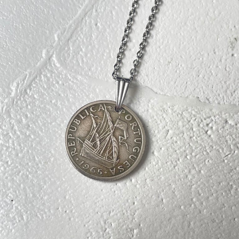 ポルトガルで1965年に発行されたヴィンテージコインをリメイクして作られた、ハンドメイドのネックレスです。