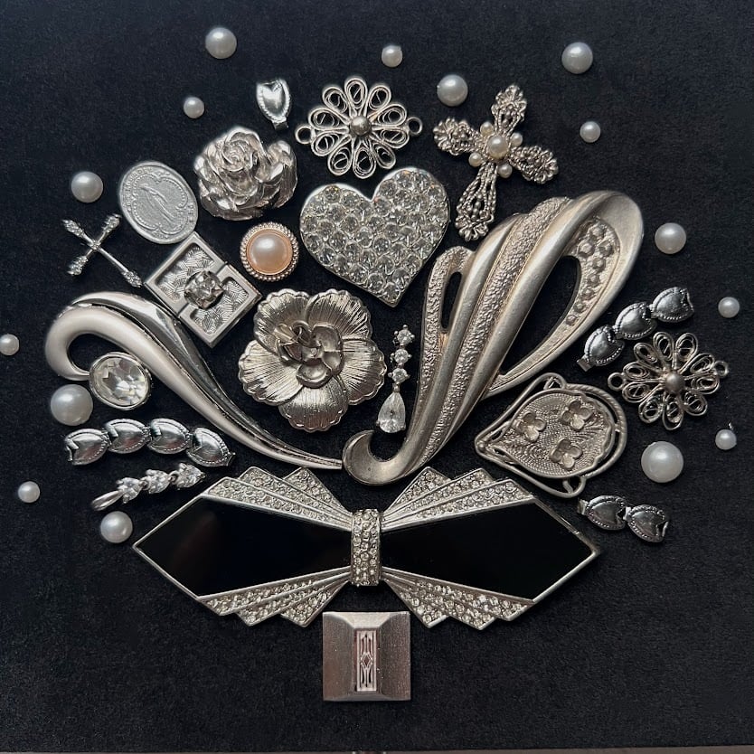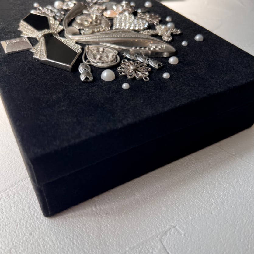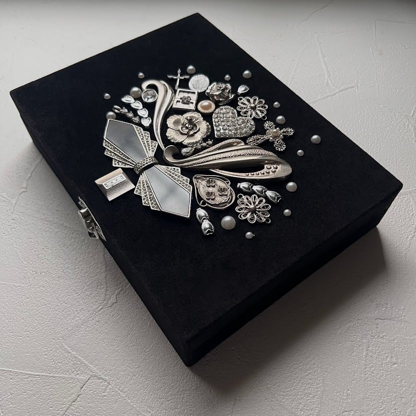 新品のジュエリーボックスに、時代を感じるモチーフ達を花束に見立てて装飾した、1点もののアップサイクルジュエリーボックスです。