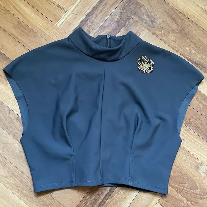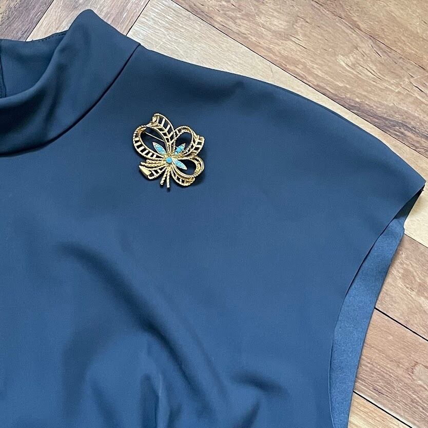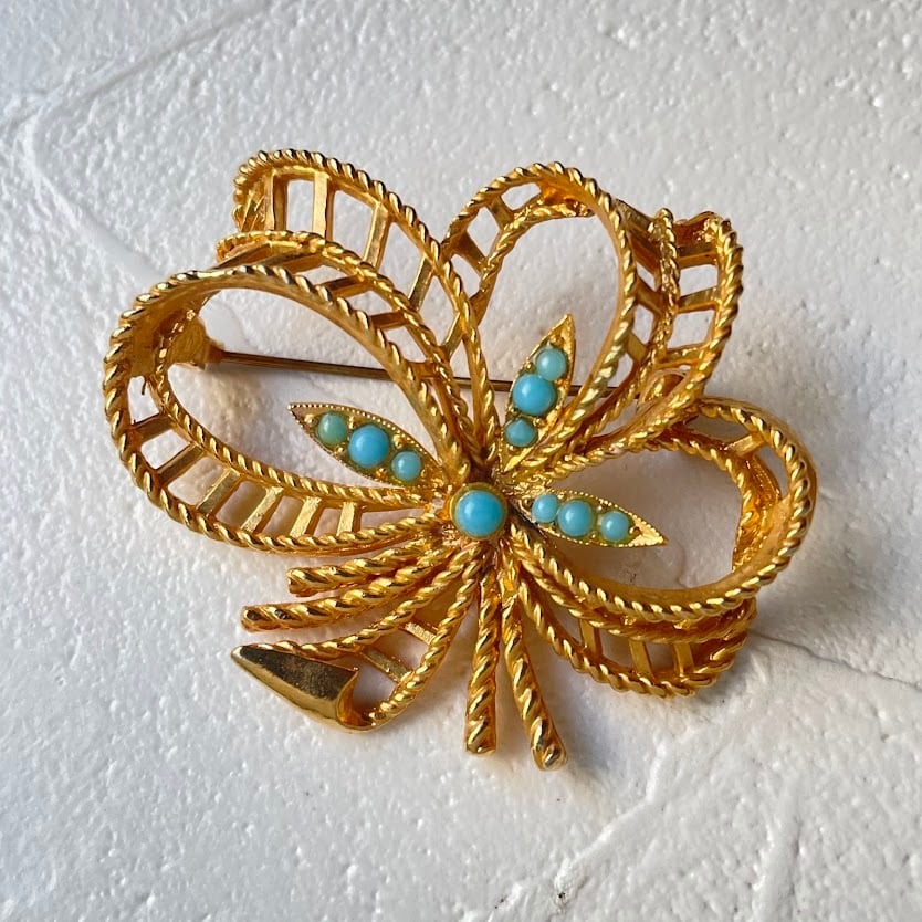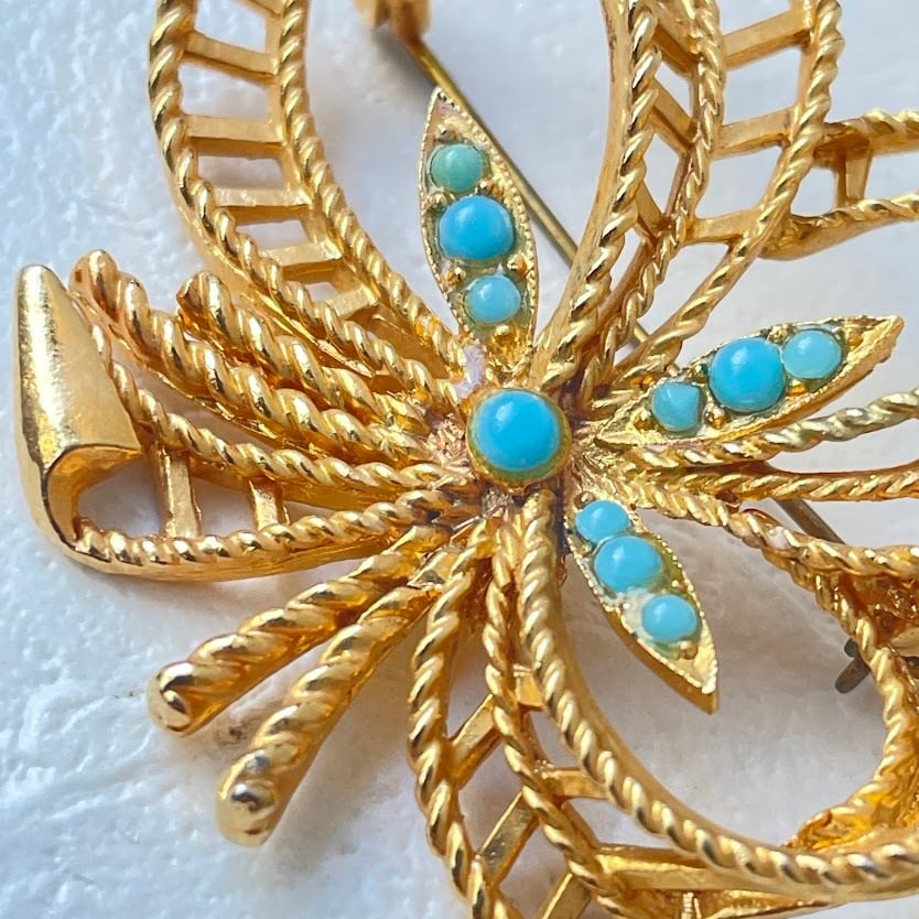 立体的なボタニカルデザインと、サックスカラーのビーズが素敵なブローチです。