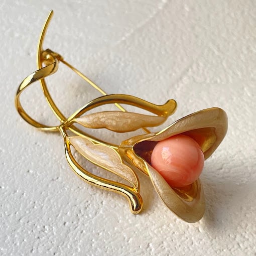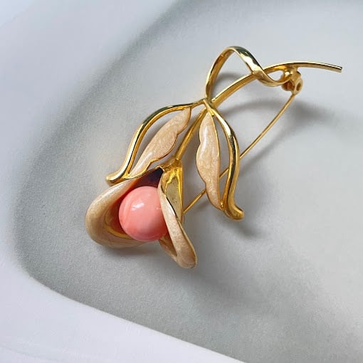 淡い色合いの立体的な花びらと、ピンク色の実が魅力のブローチです。