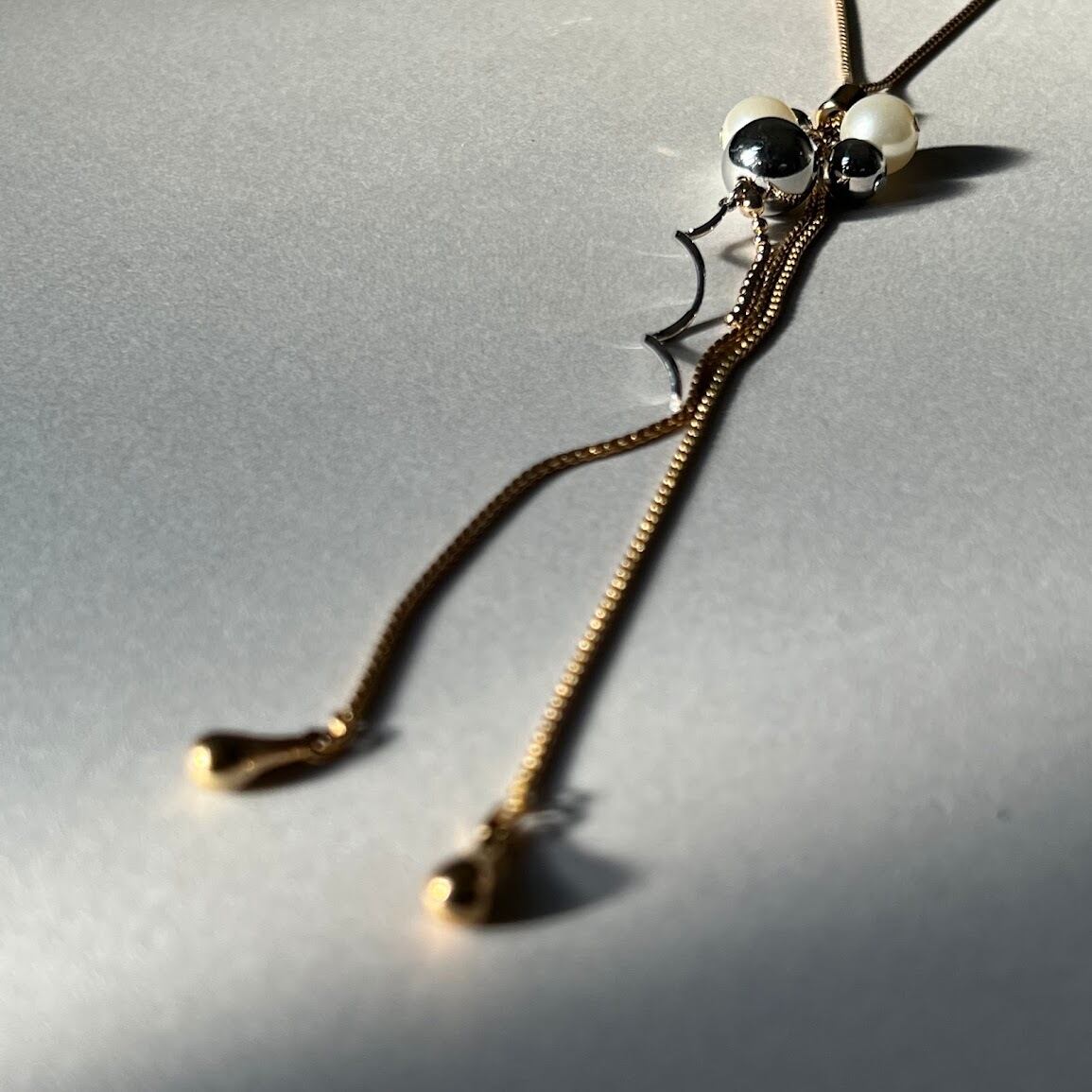 パールとメタルのパーツが上品な雰囲気の、長さ調節が可能なループタイ型のネックレス。