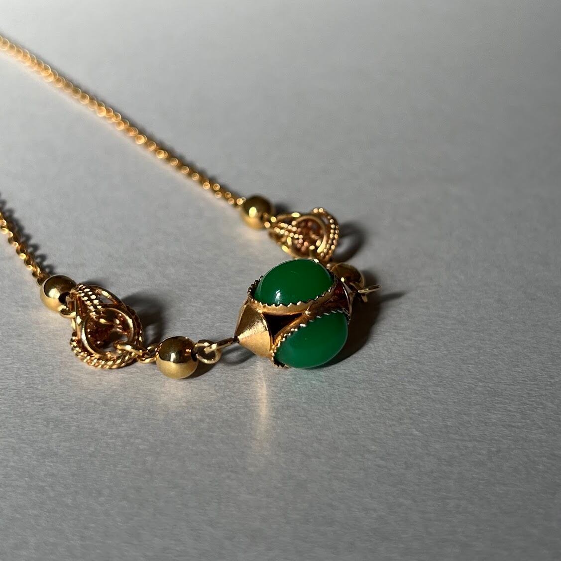 3面につけられたグリーンのパーツと、メタルの組み合わせが雰囲気のあるネックレスです。