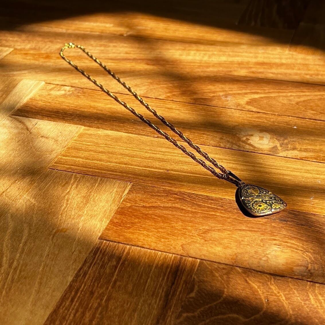幾何学模や草花、鳥などが描かれた優雅なデザインのネックレスです。