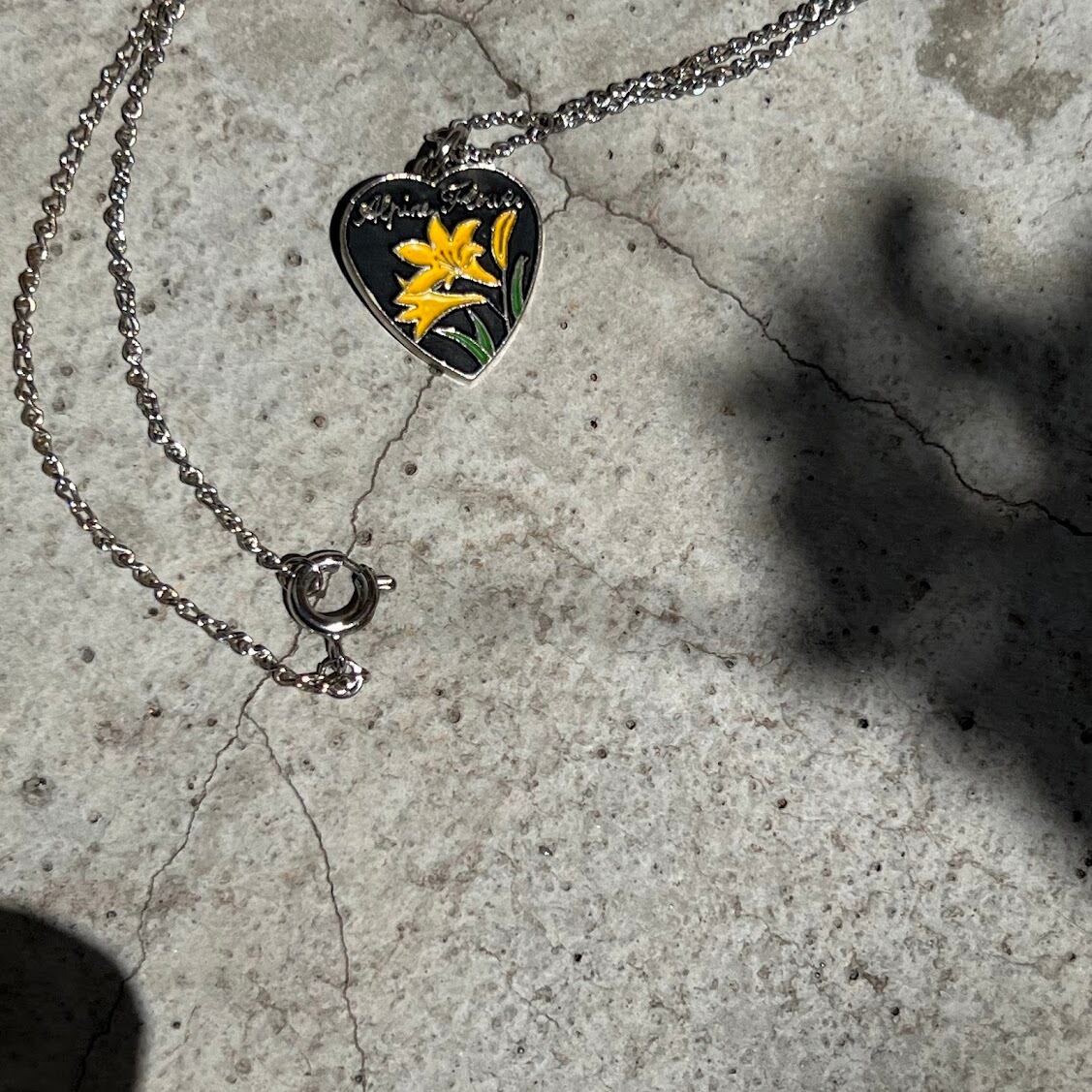 トップに描かれたニッコウキスゲのイラストと、裏側の花言葉が雰囲気あるネックレスです。