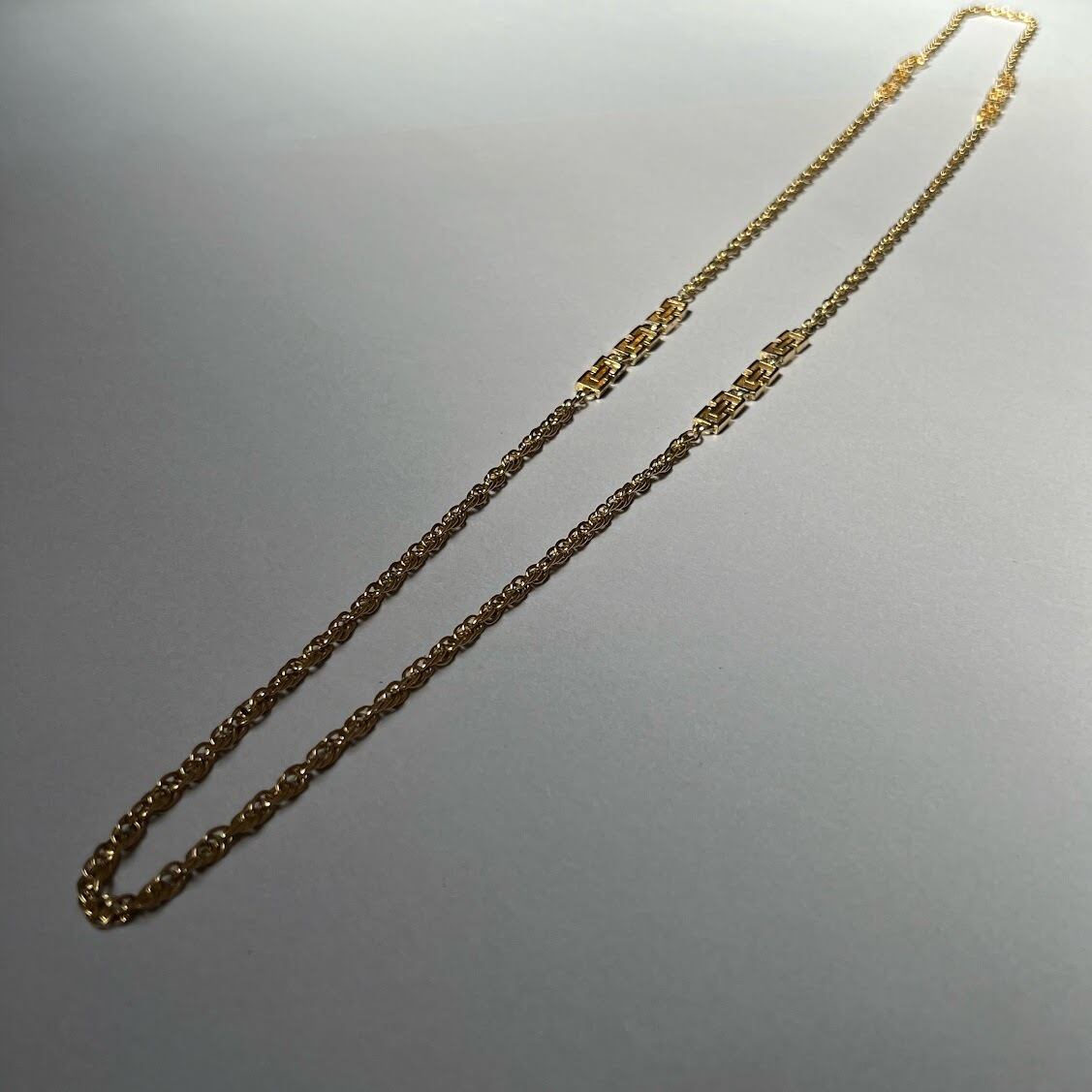 ロゴのようなパーツとボリュームあるチェーンが雰囲気あるロングネックレスです。