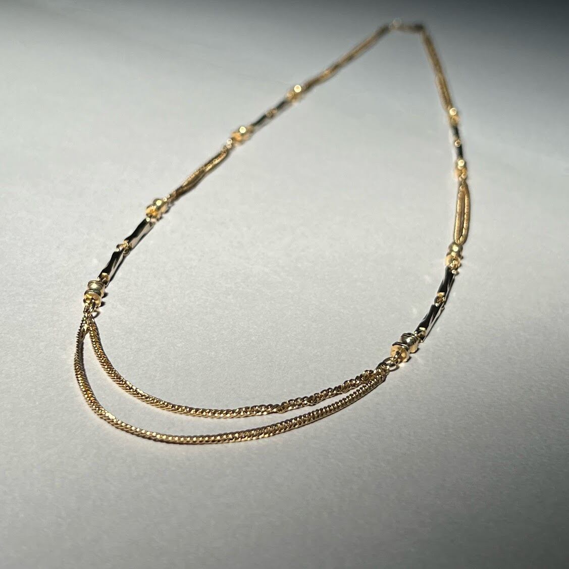 シンプルながらも、品のある個性的なパーツが使われた、チェーンネックレスです。