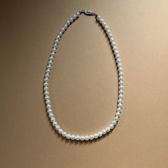 シンプルなパールが着けやすく、バックスタイルを華やかにするデザインされた金具が素敵なネックレスです。