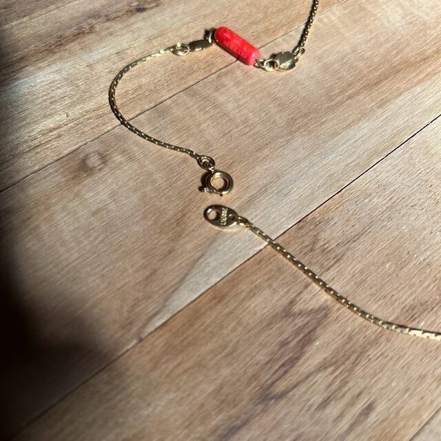 赤いビーズが実のように、リーフパーツと並ぶロングネックレスです。