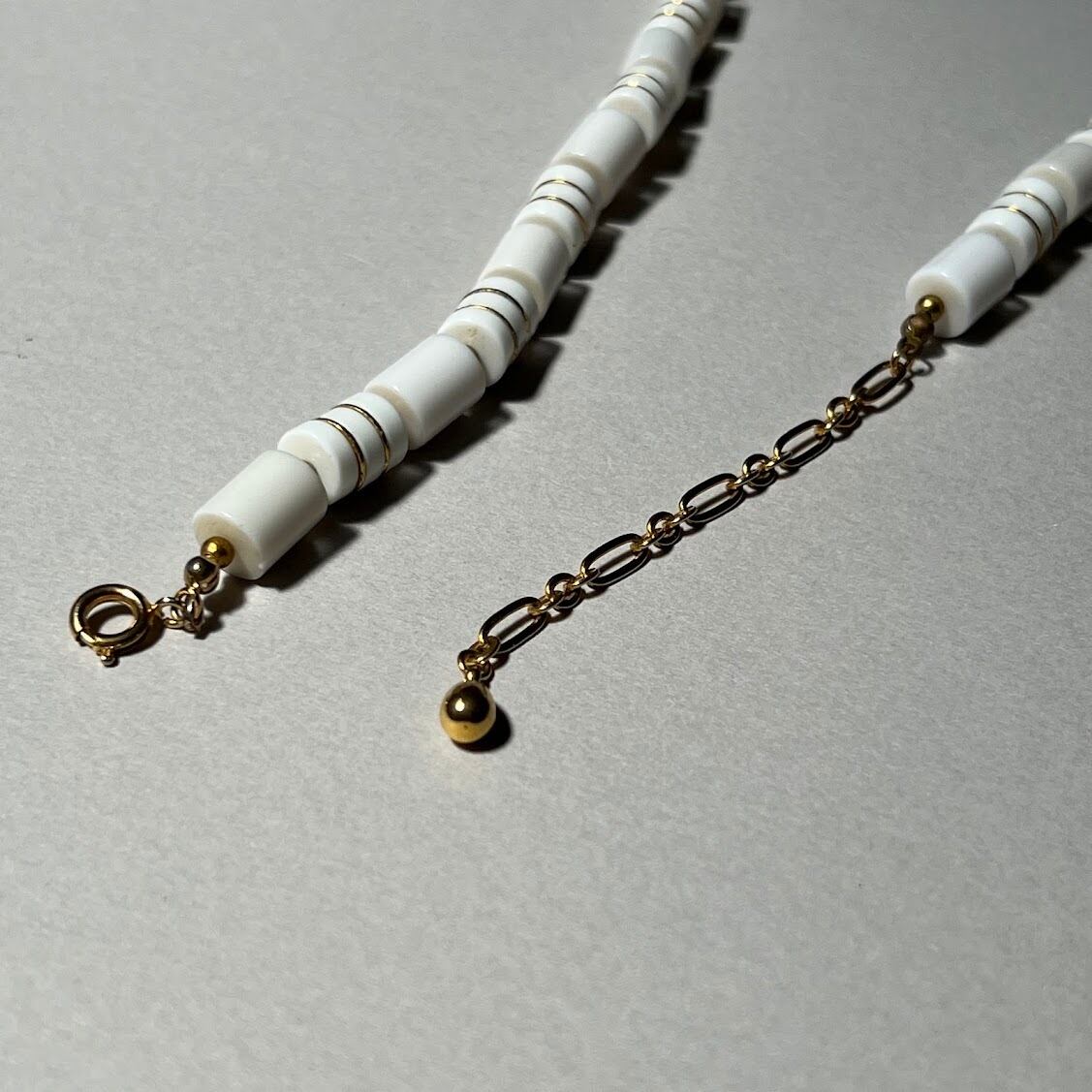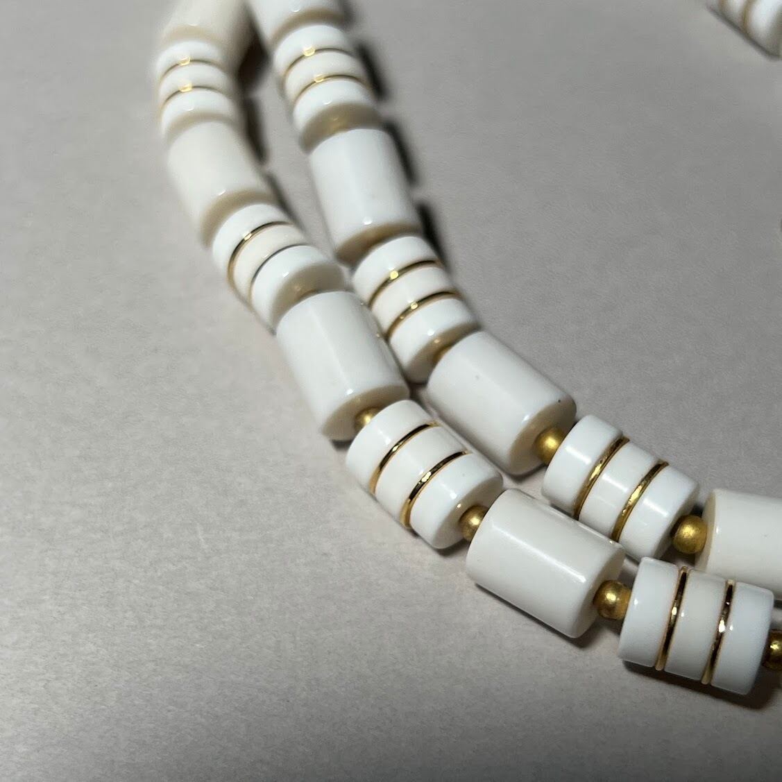 ホワイトのビーズにゴールドのラインがヴィンテージライクなネックレスです。