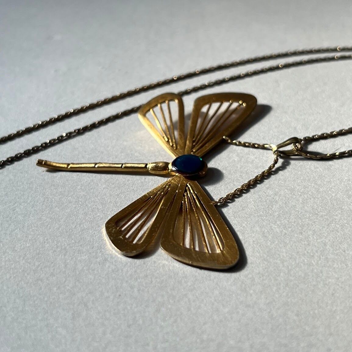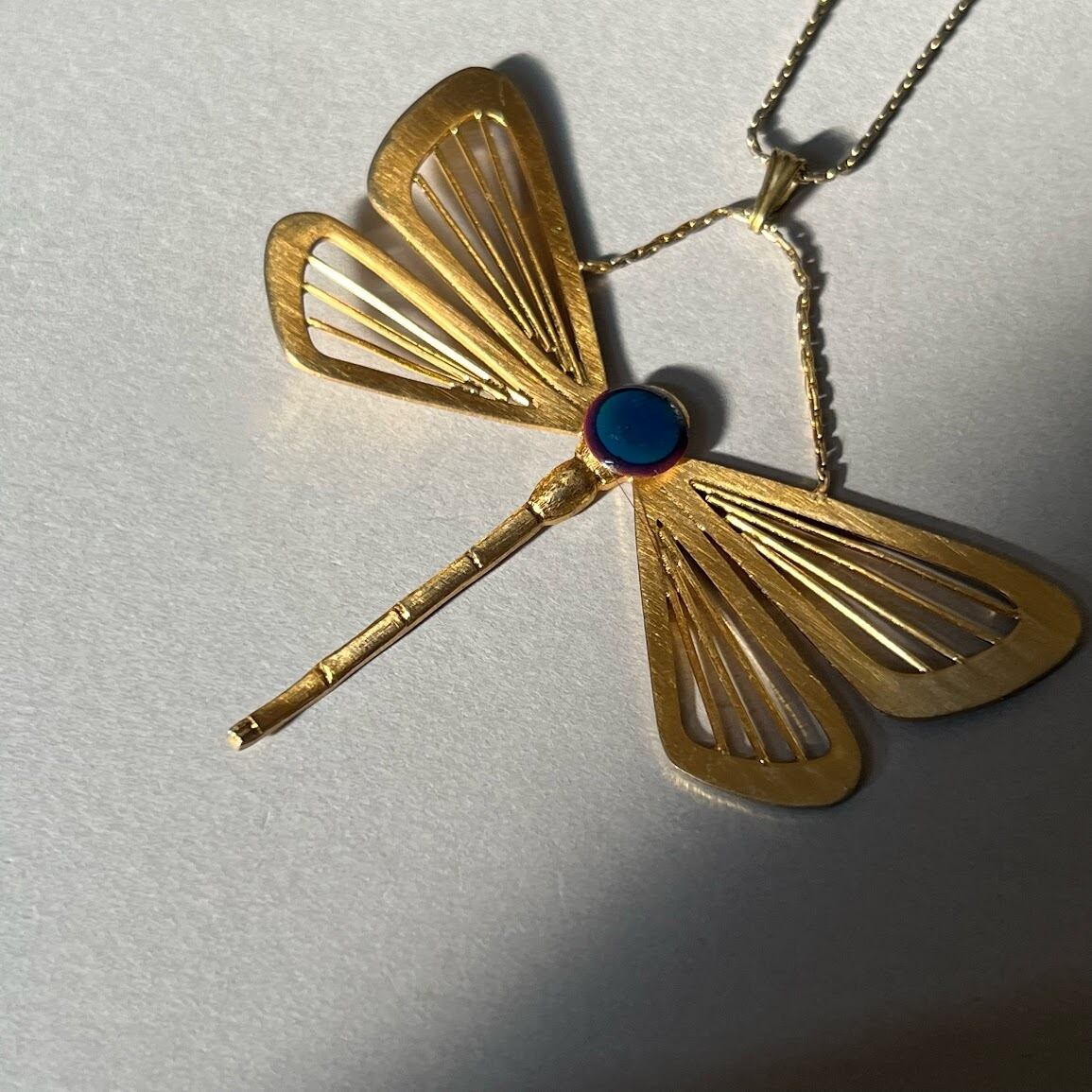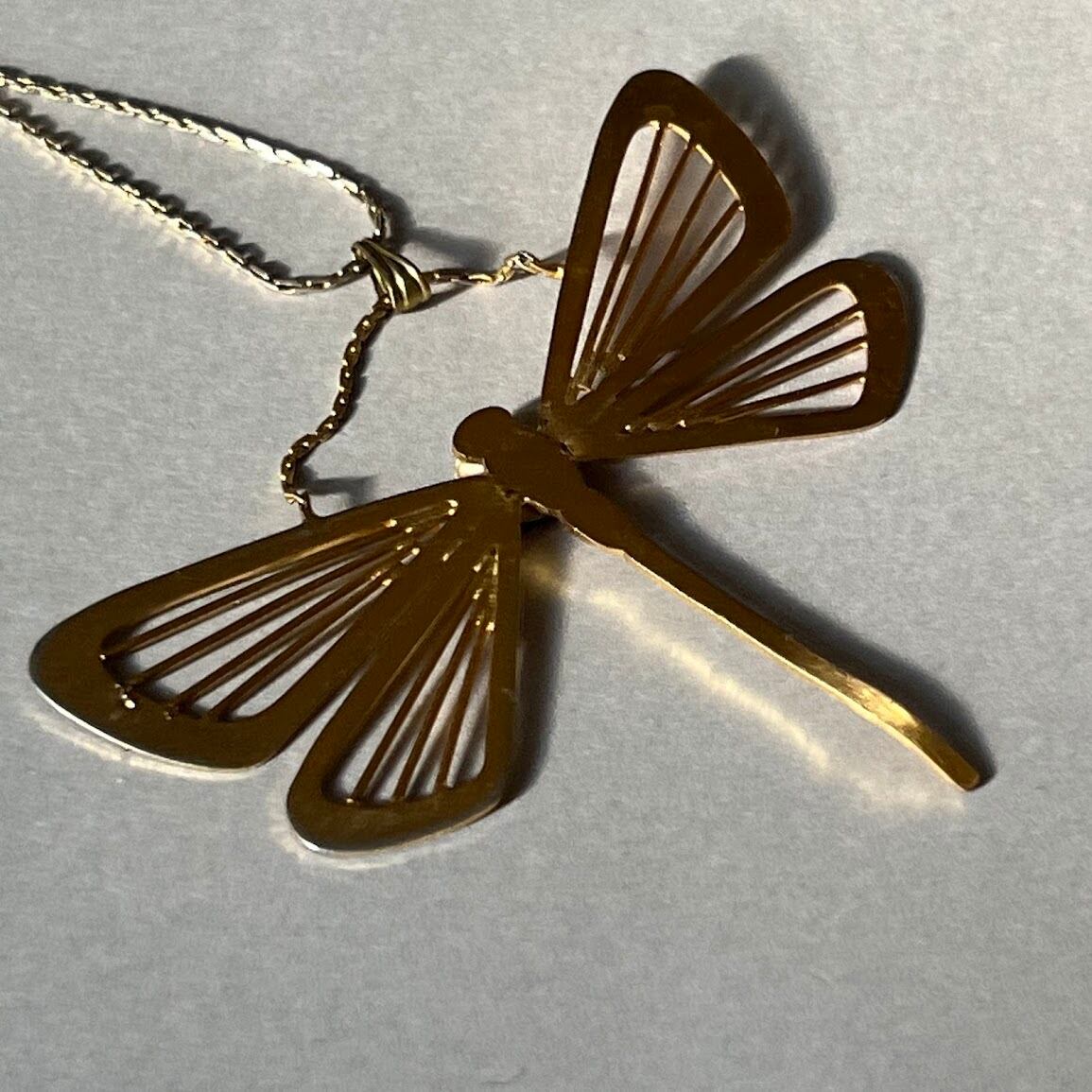 ユニークなトンボモチーフが目を引く、個性的なネックレスです。