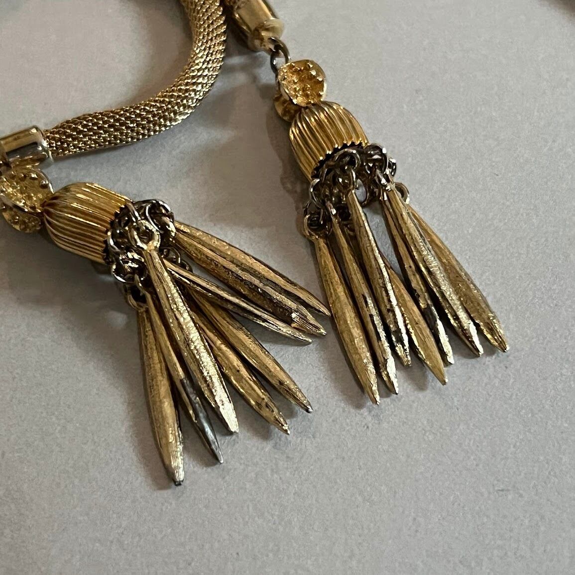 スライドパーツや、メタルタッセルに雰囲気あるパーツが使われた、長さ調節が可能なループタイ型のネックレスです。