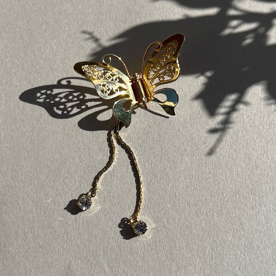 蝶々の羽に入った透かしの軽やかなデザインと、揺れるラインストーンが素敵なブローチです。