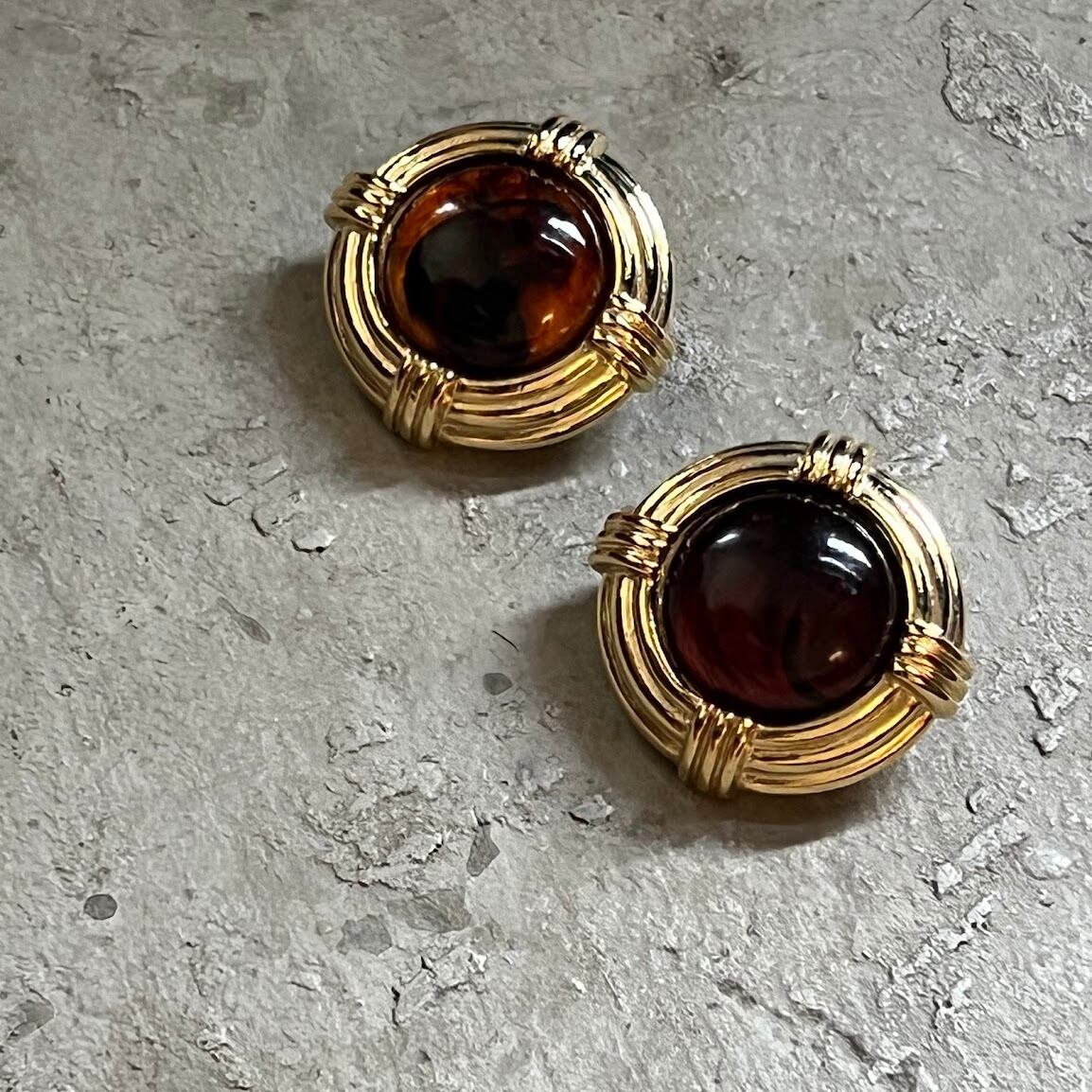 アンバーカラーの部分に光があたると、透けて表情が変わるクラシカルなデザインのイヤリングです。