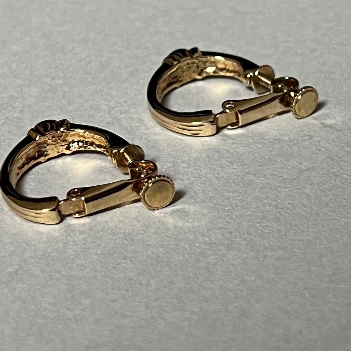 フープ部分の細かなデザインと、さりげなく輝く赤いガラスが素敵なイヤリングです。