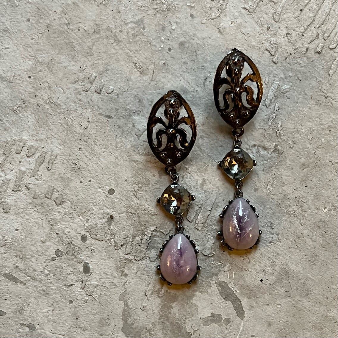 ブラックのベースに透かしのデザインと天然石が雰囲気あるイヤリングです。