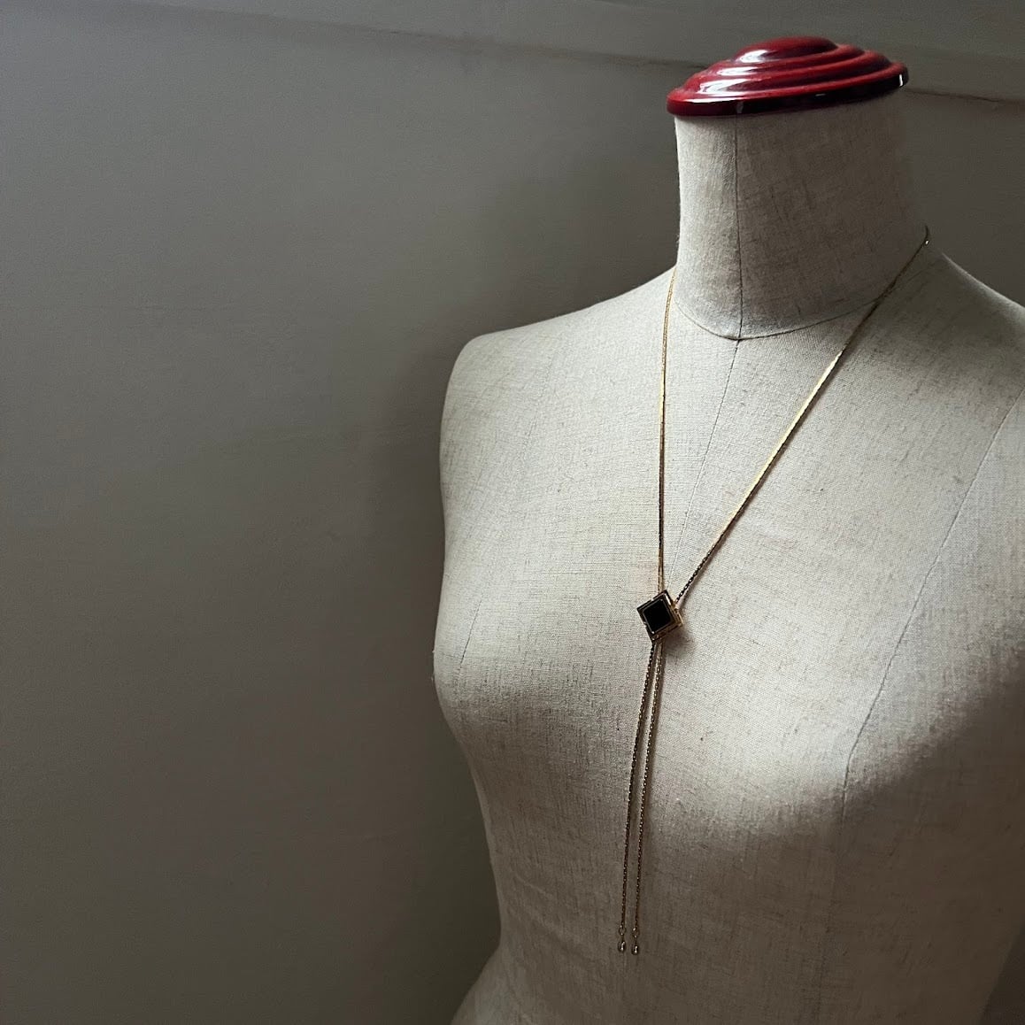 ブラックの天然石がシックに輝く、ループタイのネックレスです