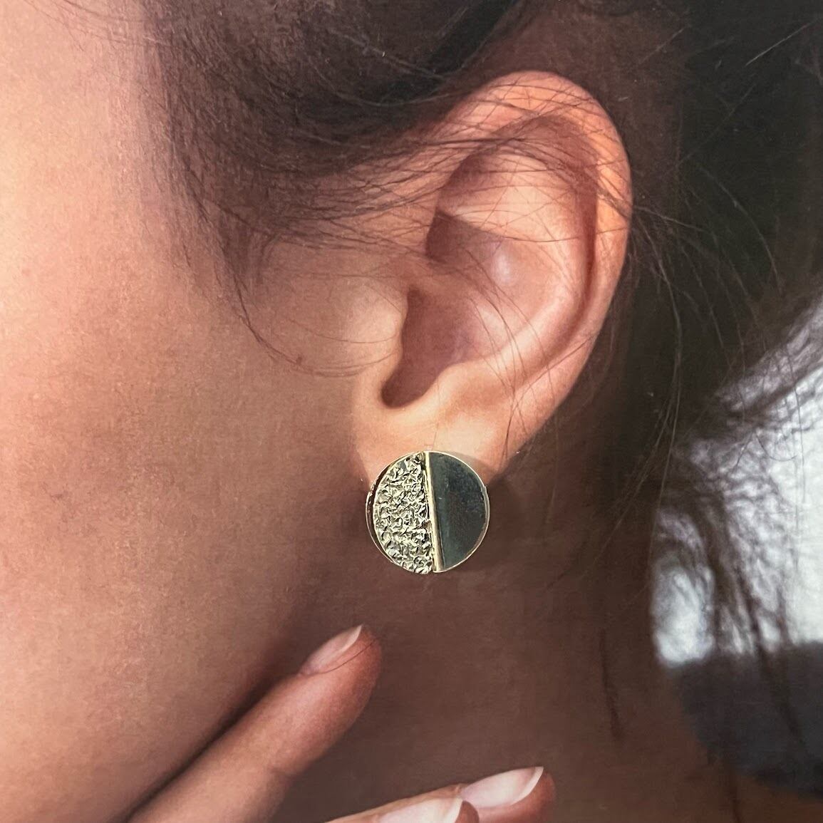 角度がついた独特な形状や、メタルとテクスチャーの合わせが、エッジの効いたイヤリングです。
