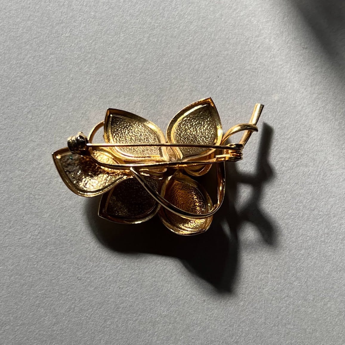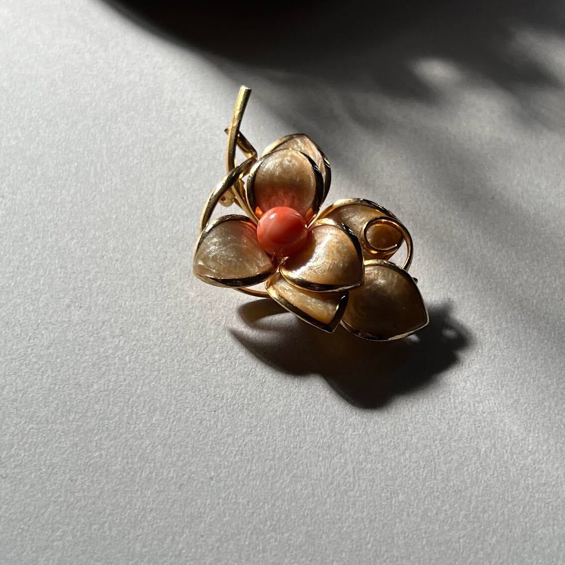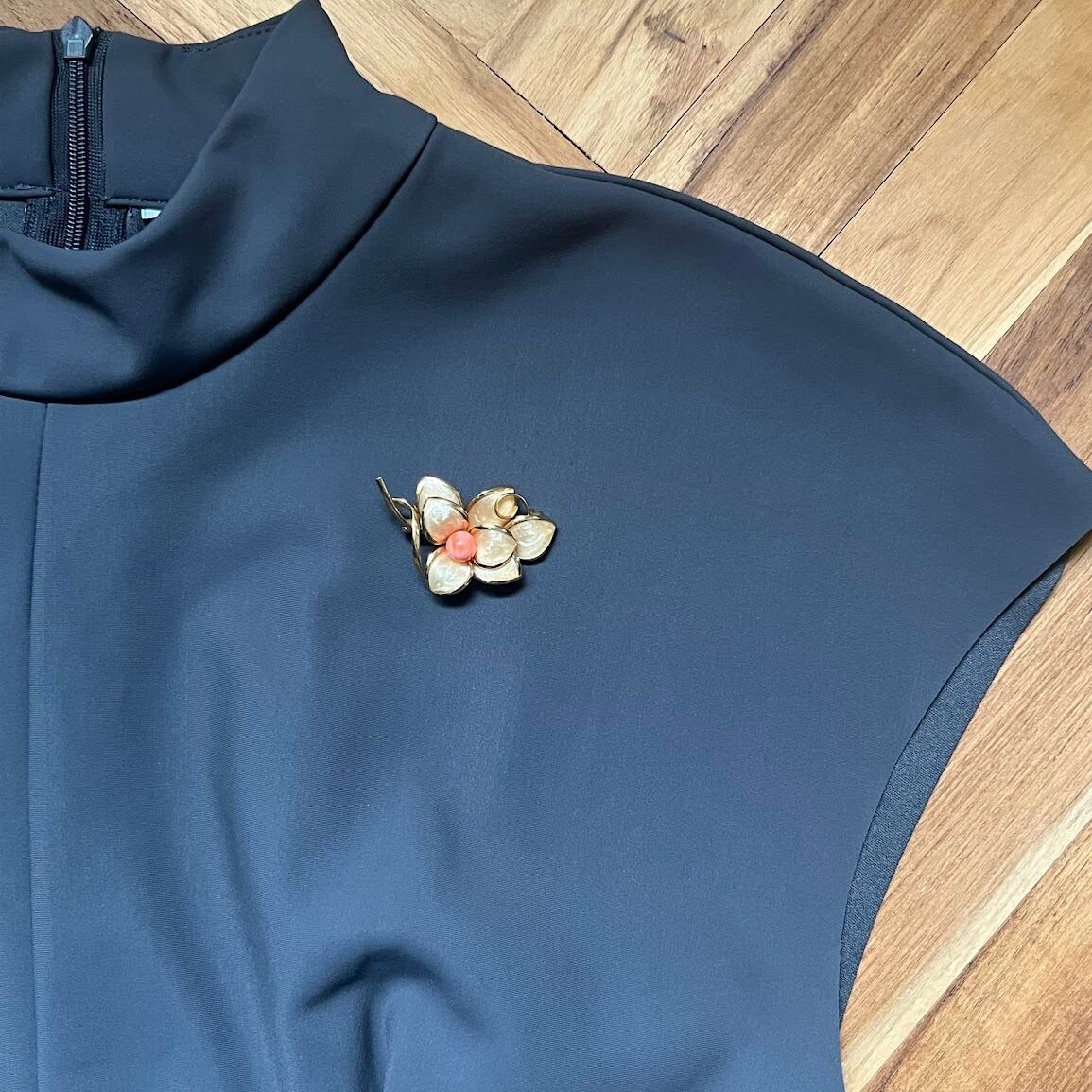 立体的な花びらと、オレンジの実がポイントのブローチです。