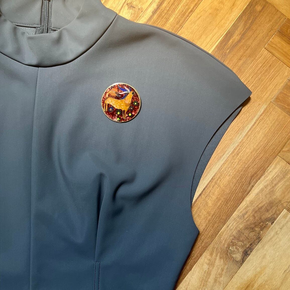 ピン部分は、回転ブローチピン式で、針の先端部分をロックすることができ、誤って指を刺してしまったり、つけている間に外れてしまう心配が少ないタイプです。